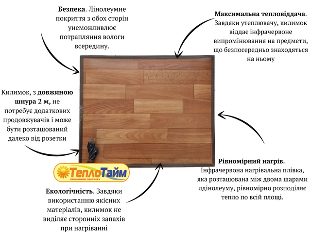 Коврик состоит из нагревательного елементу- инфракрасная нагревательная пленка, которая расположена между двумя слоями коврового материала, равномерно распределяет тепло по всей площади, не допуская перегрев коврика.Тепло, которое выделяется пленкой, по ощущениям и воздействию можно сравнить с солнечным теплом.
