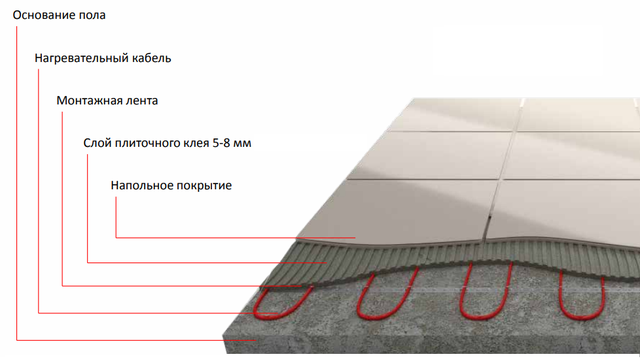 Для монтажа нагревательного кабеля под плитку нужно закрепить на полу специальную монтажную ленту к которой и будет крепится сам кабель. После этого можно наносить слой плиточного клея для последующего монтажа на нем плитки. Важно наносить клей так чтобы не оставалось воздушных пустот. Включать кабель можно только тогда когда плиточный клей полностью засохнет.